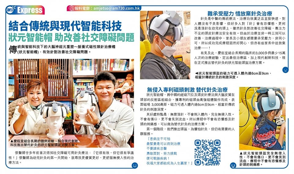 傳統與智能科技下的大腦神經元重塑~脈衝式磁性頭針治療帽(狀元智能帽)有效治癒自閉症。 二十多年前,張醫師初次接觸以針灸改善自閉症及專注力不足的療法,親眼見證其成效,也深知其挑戰。針灸作為中醫的重要手段,作用直接、安全,且無藥物副作用,尤其針對頭皮特定穴位,對神經發展有獨特調節作用。 然而,「針」一字對許多孩子和家長而言,始終帶來壓力與恐懼,尤其當針需落於頭部。雖然療法本身安全有效,但自閉症與ADHD的改善需長期堅持,過程中孩子的情緒和家長的身心負擔,往往成為中途停下的原因。 有見於此,慶鈺堂結合近30年、超過3,000例、累計25萬人次的臨床經驗,深入分析最有效的治療區域,並融合現代科技,正式推出新一代非侵入式方案:狀元智能帽。 狀元智能帽融合中醫經絡理論、頭皮針療法與大腦皮質反射區的科學依據,採用專利高強磁頭,表面磁場達3000高斯,磁力可穿透6至9厘米,相當於傳統針灸的刺激深度,實現零針、零創、零痛、無恐懼的治療體驗。 這不僅是科技的進步,更是對孩子感受的尊重,讓療程不再是一場考驗,而是一段溫和穩妥的陪伴。