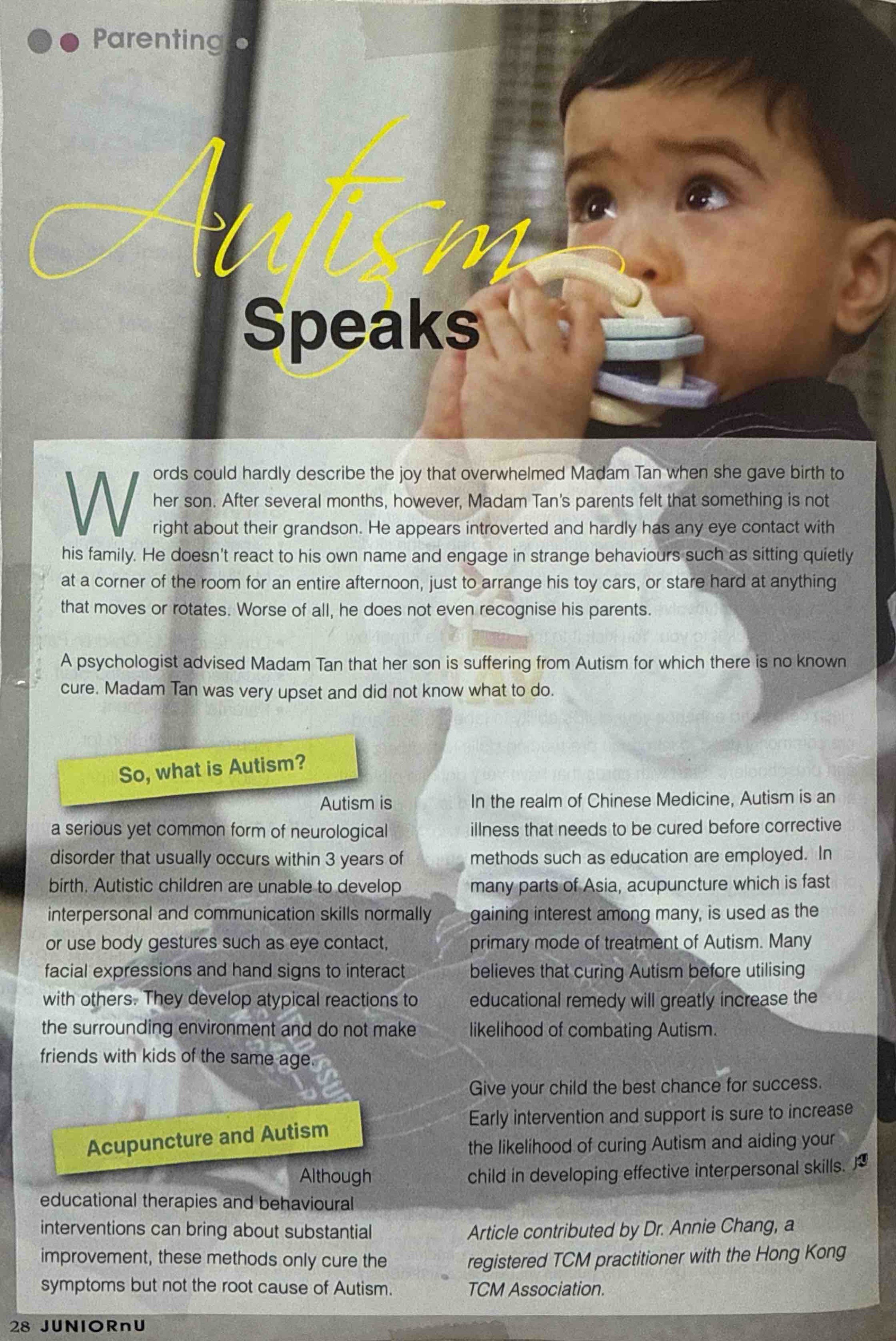 我哋個仔從小確診嚴重自閉症,幾乎唔講嘢唔同人交流。經黃醫師五年幾嘅針灸、推拿同中藥調理,佢慢慢肯開口,情緒穩定落嚟。而家佢不但溝通無礙,仲考入名牌醫學院,立志做醫生幫其他細路。我哋真心感恩。